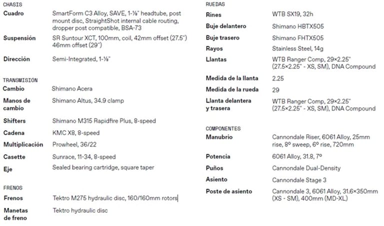 - Horquilla de suspensión SR Suntour XCT, 100 mm de recorrido.